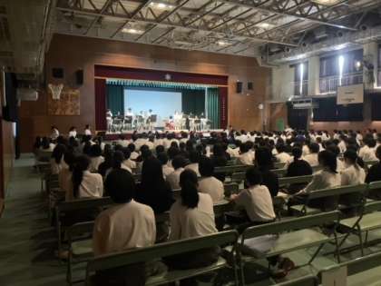 音楽部が演奏やダンスを発表しました。途中からフロアの生徒たちも一緒にダンスを踊る場面もあり、大いに盛り上がりました。