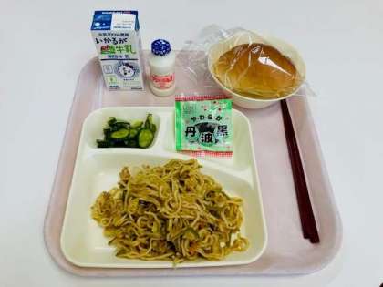 焼きそば、きゅうりのしょうがづけ、ソフト黒豆、ミニコッペパン、発酵乳、牛乳