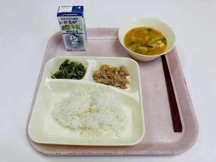 豚肉のしょうが焼き、じゃこピーマン、とうふの味噌汁、ごはん、牛乳