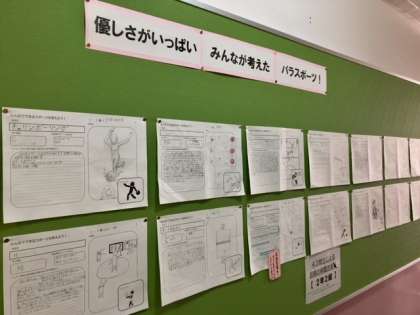 1年生時の3学期に取り組んだ特別支援教育では、新しいパラスポーツを考えました。一人ひとりのアイデアが廊下に掲示されています。