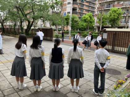 生徒会執行部が正門であいさつ運動をしています。