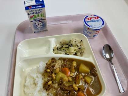 今日のメニューは、牛肉と大豆のカレーライス、キャベツのひじきドレッシング、ヨーグルト、そして牛乳です。