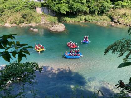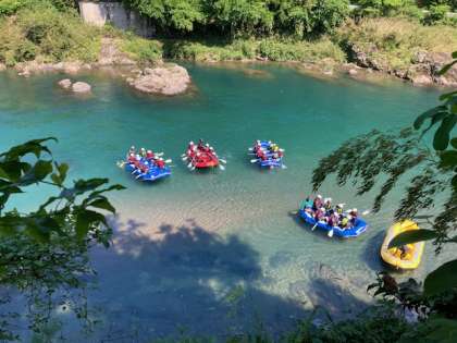 最高の天気のもと、歓声が響きあうラフティングも終わりにさしかかっています。