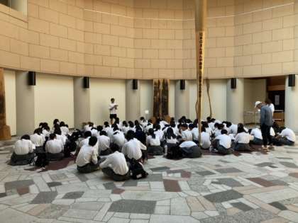 ラフティングが終わり、日本まん真ん中センターで諸連絡をしています。
