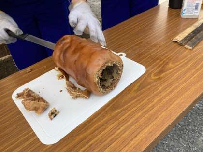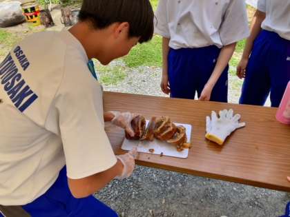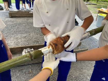 竹からバームクーヘンを抜き取って完成です。班ごとに味が違いますが、どの班も美味しく出来上がりました。