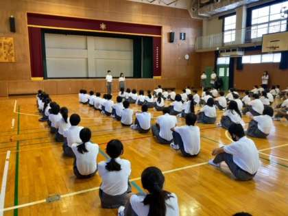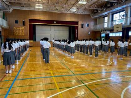 昨日の各種委員会で話し合った今月の目標を代表生徒が報告しています。