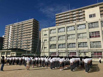 本日は久しぶりにグラウンドにて全校集会を行いました。