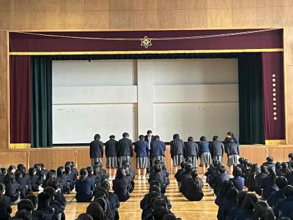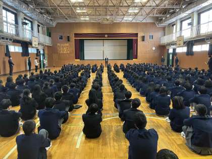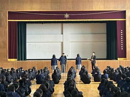 終業式では2学期の行事や普段のみんなの頑張り、冬休みの過ごし方について話がありました。