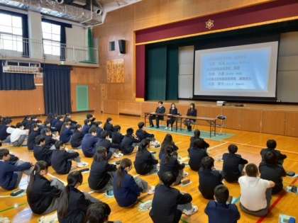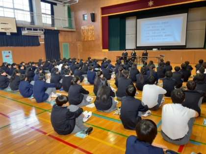 2年生では、本校の卒業生である3人の高校生をゲストティーチャーとしてインタビュー形式の進路講話を行いました。卒業生からは、どのように高校を選んだか、どんな準備をしてきたか、中学2年生の冬にはどんなことを考えていたかなどの話をきくことができました。