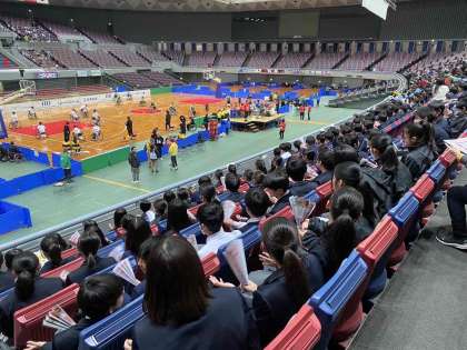 会場に到着し、試合観戦を行っています。