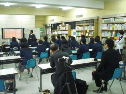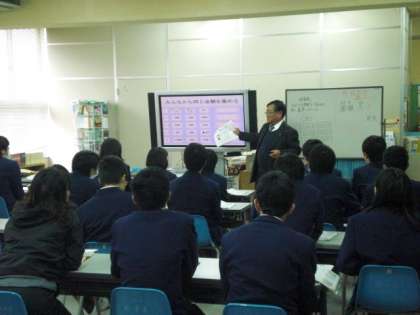 平成27年1月18日(月)4階の図書室において第2限3年1組、第3限3年2組、第4限3年3組の順で租税教室が行われました。税務署から職員の方が1名、講師として税理士の方が3名来られ、電子黒板を使って授業していただきました。最初は緊張気味に聞いていた生徒達もクイズを出されて答えるときは、元気よく手を挙げ場の雰囲気が和んでいました。中学生にとって税金の話は難しかったかもわかりませんが、決して関係ないことではなく、今後も関心を持って生活してほしいと熱く語っておられた様子が印象的でした。