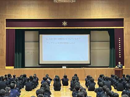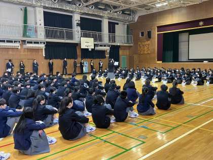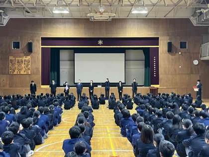 1学期の始業式を行い、新転任の教職員の紹介や校長先生のお話を聞きました。その後、生徒会主催の対面式を行い、1年生と2・3年生が初めて顔を合わせました。
