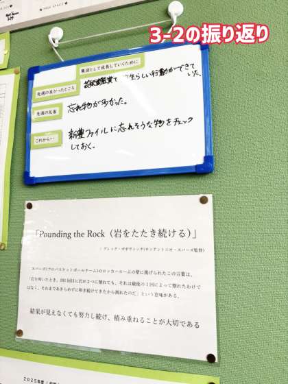担任の先生にお聞きしたところ、「上のホワイトボードは、1週間の振り返りを学級代表にクラスのよかったところや悪かったところなどを書いてもらっています。下の"Pounding the Rock"は尊敬するNBAの監督の言葉です。この言葉から、いろんなことを感じ取ってほしいです」とのことです。