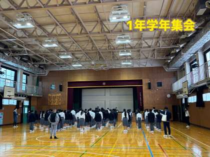 大きな声の挨拶でスタートした1年学年集会。 先生のお話をしっかり聞いています。