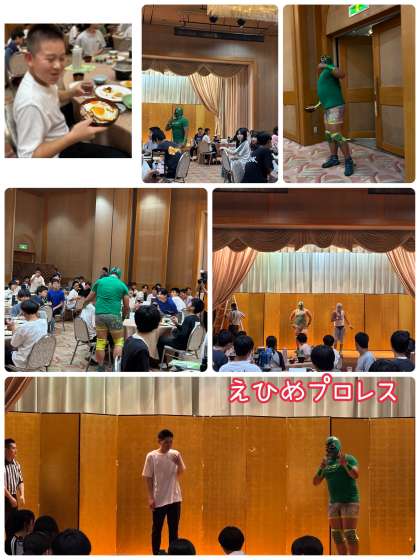 食事の途中、えひめプロレスのみなさんがパフォーマンスを見せてくれました。みんな大盛り上がりでした。1,2組の担任の先生や、生徒会の生徒なども急遽参加しました。