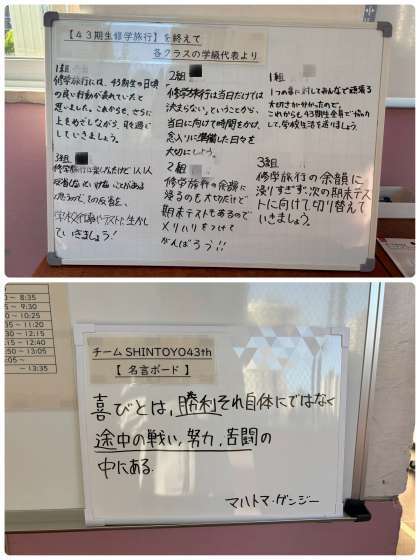 そして、学年のボードには学級代表からの修学旅行の感想が書かれていたり、名言ボードにも新しい言葉が紹介されたりしていました。