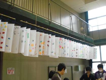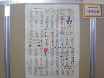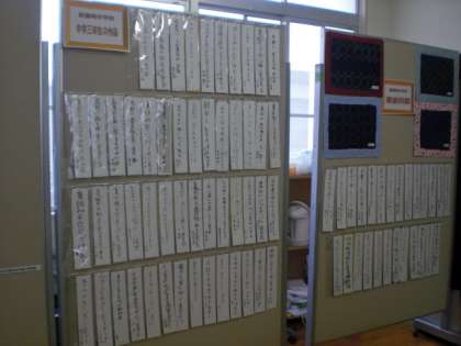 写真は、国語科3年生のペン習字、美術科2年生の作品、1年の班新聞です。