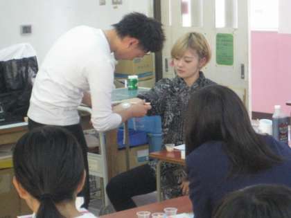 最初に映像で説明していただき、その後、特殊メイクを各自の腕にしました。