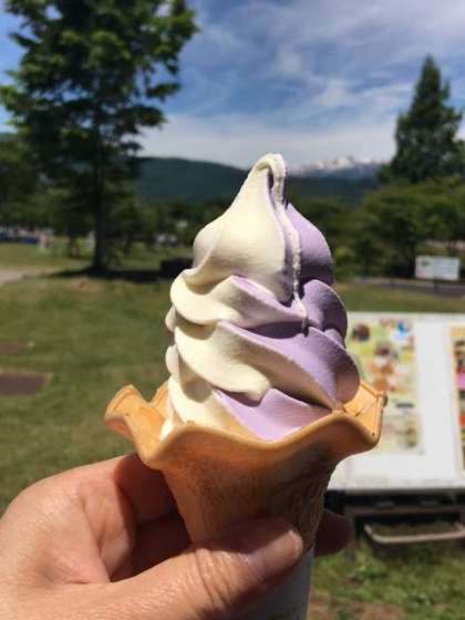 牧歌の里では、何年ぶりかの「汽車ぽっぽ」に乗り、ソフトクリームを食べながらのんびり過ごしています。