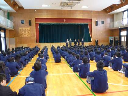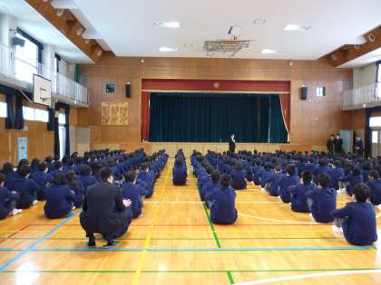 にて、離任者紹介、着任式、学年所属発表(1年→2年→3年の順)