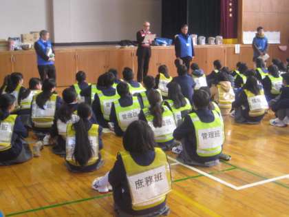 1月24日(水)5、6限、2年生は、防災学習を実施しまいた。今回は、今までの学習をもとに、実践体験を行ないました。体育館に本部を開設し、地域巡視・要救護者救出体験・貯水槽見学などを行いました。