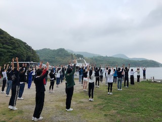 朝礼でラジオ体操を終え、これから朝ごはんです。