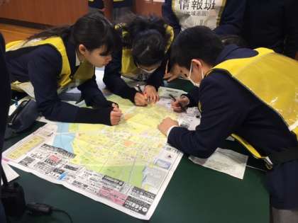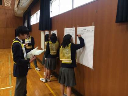 1月25日(金)5、6限、2年生は、防災学習を実施しまいた。今回は、今までの学習をもとに、実践体験を行ないました。体育館に本部を開設し、地域巡視・簡易トイレ等の設置体験・貯水槽見学などを行いました。