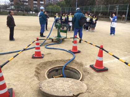 豊崎東公園の地下に設置されている貯水槽の簡易水道を見学しました。