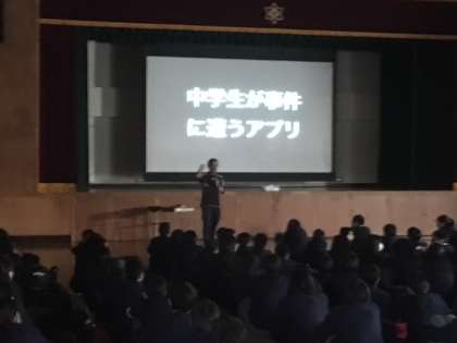 2月12日(火)終学活後、「SNS等の危険性の再認識と未然防止」を目的に全校集会を開きました。生活指導の担当者が映像資料を活用し、注意喚起を行いました。