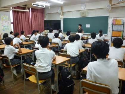 あるクラスでは生徒達だけで司会や連絡を行っており、みんな静かに話を聞いています。
