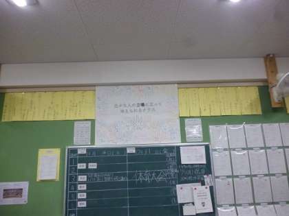 真ん中に「色々な人の立場に立って考えられるクラス」と目標が書かれ、その周りを生徒のみなさん、そして学級担任、副担任の先生方の手で囲んでいました。