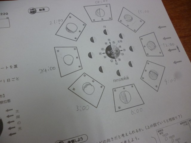 理科の授業では、グループに分かれて月の満ち欠けについて学んでいました。