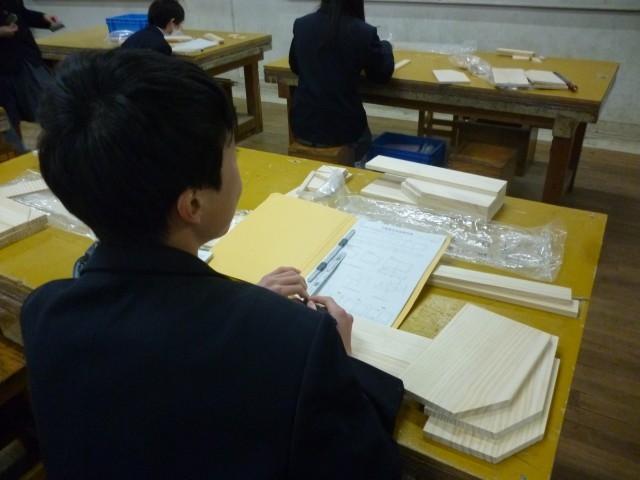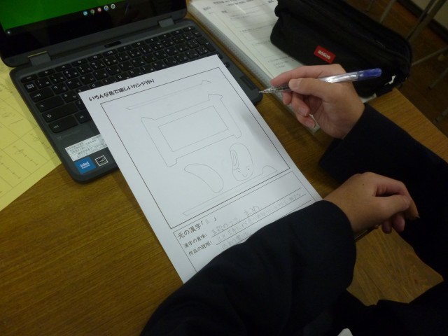 美術では、自分で選んだ漢字にデザインを作成しています。
