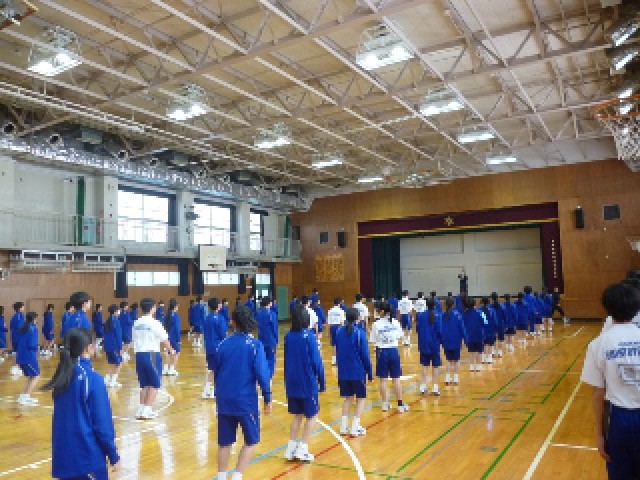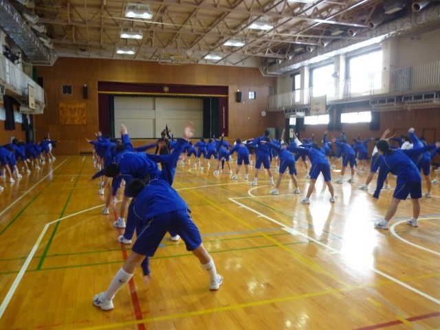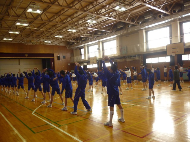 2時間目の2年生の様子を見ました。準備体操を音楽に合わせて行っていました。
