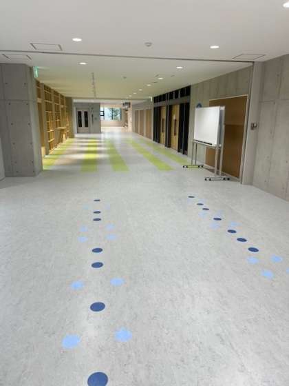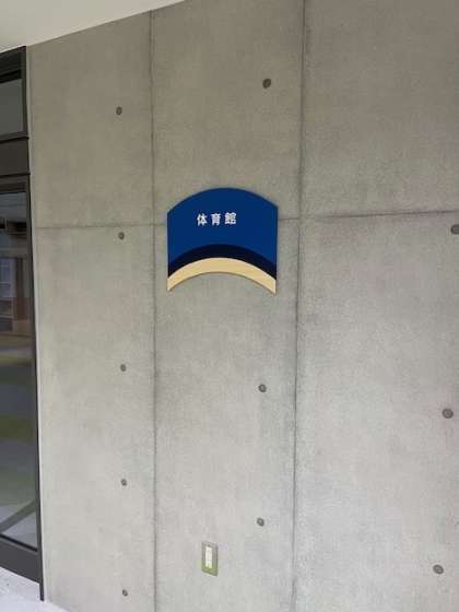 特別教室の中には、突出サインの他に、壁や柱に大きなサイン表示がされているものがあります。図書室や体育館の入り口付近にその表示が見られます。