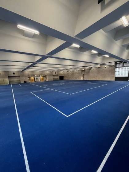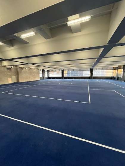 6階の屋内グランドが完成間近です。青色のゴムチップウレタンの上に、ドッジボールのコートが描かれています。南側と西側が大きく開いているので、よく風が通ります。天候に左右されずに活動できるフロアなので、開校後、大いに活用できそうです。