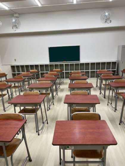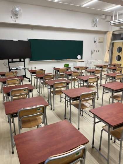 普通教室の整備がほぼ完了し、いよいよ児童生徒たちを迎え入れる準備が最終段階に来ています。写真は7年生の教室です。すべての普通教室には大型モニターが設置されています。