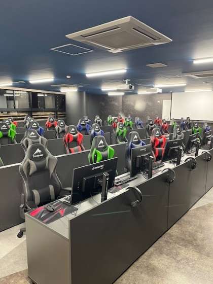 4階のパソコン教室1はeスポーツ仕様になっています。教室天井や壁面のデザインもオリジナルです。ゲーミングチェアがおかれていることで、臨場感が伝わってきます。