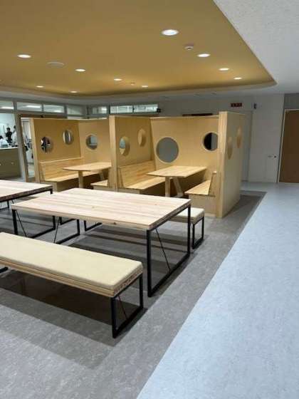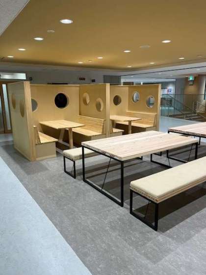 職員室前のワークスペースは大きなベンチや個別ブースが設置されています。