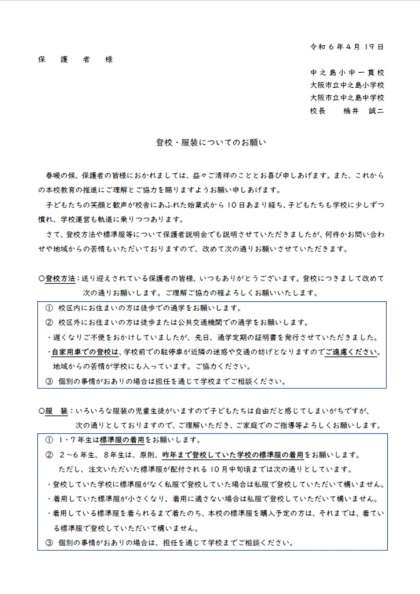 登校方法や標準服等について保護者説明会でも説明させていただきましたが、何件かお問い合わせや地域からの苦情もいただいておりますので、改めてプリントを配付させていただきました。内容の詳細につきましてご確認いただきますようよろしくお願いします。