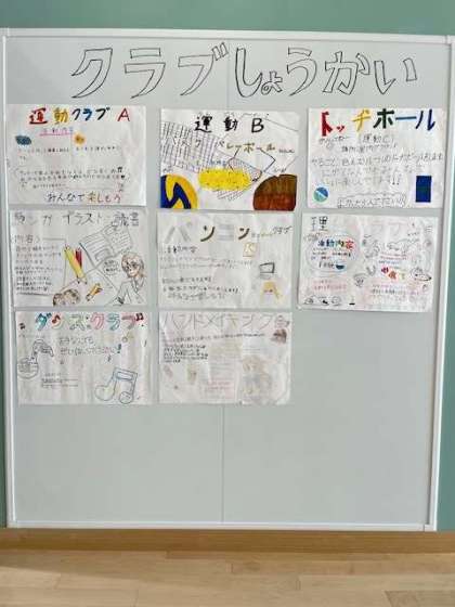 4階の掲示板には手作りのポスターが貼られています。自分の興味があるクラブを選び、学年間の交流を深めてもらいたいですね。
