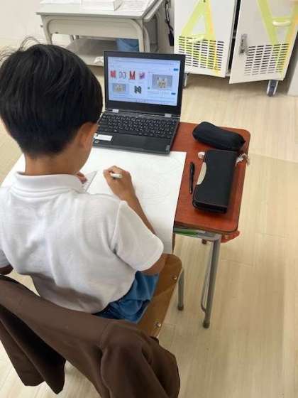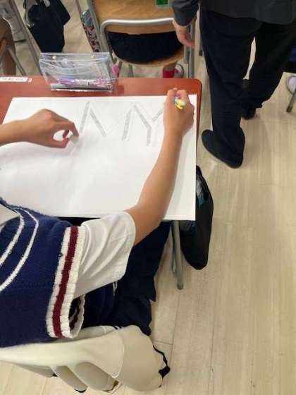 アルファベットに影をつけて立体的に見せるにはどのようにすればいいのか、各自で試行錯誤しています。授業には中学校の美術の先生も入り込み支援していました。