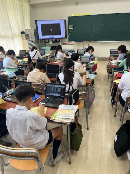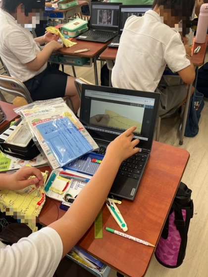 練習用の布に、並縫いや本返し縫いなど、基本となる縫い方を、動画を確認しながら各自で取り組んでいました。