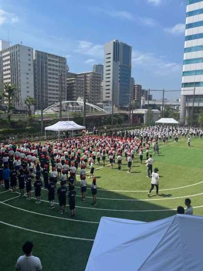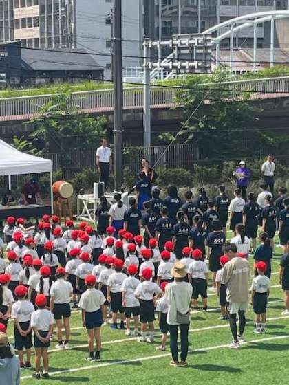 2時間目と3時間目は全学年そろっての運動会予行です。開会式の予行では開校後初めて、全員がグラウンドに集合しました。