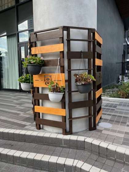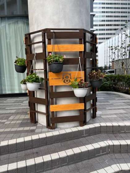 玄関の一番北側(コンビニ寄り)の柱にも、新しい鉢植えが設置されました。少し高いところに吊るされていて、こちらも管理作業員さんの手作り。植えられている花はベコニアです。今後はバラも植えられる予定です。バラは北区の花でもあります。大きな花を咲かせ親しみのある花になってもらいたいです
