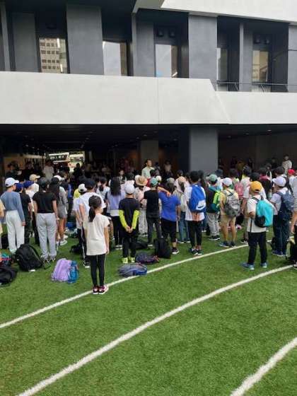 7:30に学校に集合し、出発式を行いました。たくさんの保護者のみなさまもお見送りに駆けつけてくださいました。