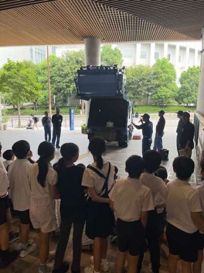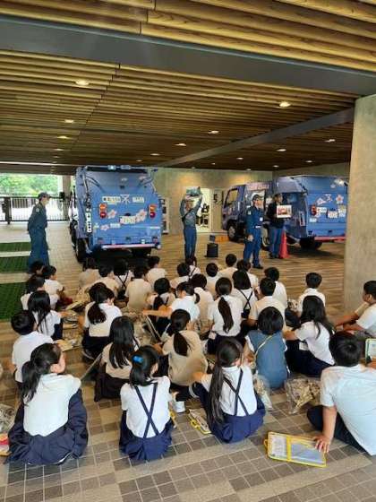大阪市環境局よりゲストティーチャーをお招きし、パッカー車を前に授業をしていただきました。