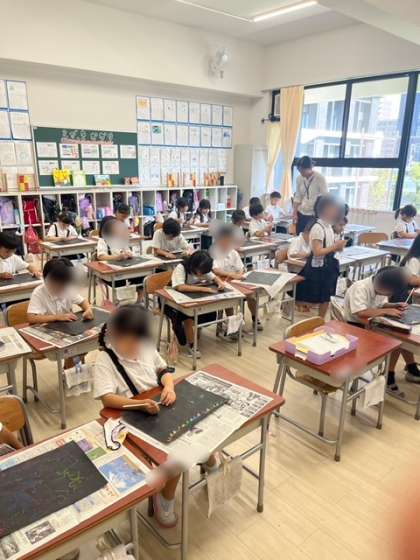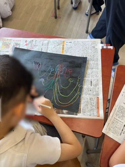 スクラッチアートとは、黒いスクラッチ面を削り、下から出てくるカラフルな線で絵を描くけずり絵です。テーマは、