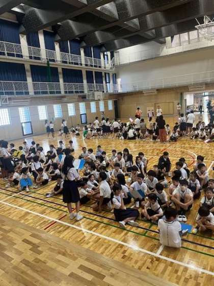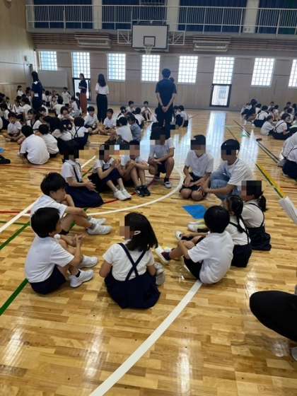 高学年の児童が自分の班の子の手を引いて体育館に向かい、初顔合わせの今回は緊張の面持ちで自己紹介をしました。異学年間の交流から、よりよい社会性を身につけてもらいたいですね。
