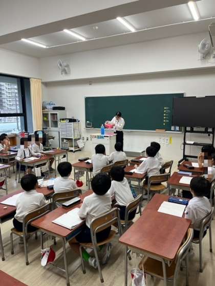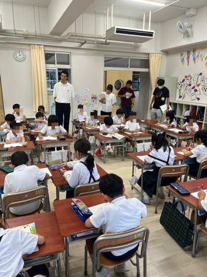 子どもたちが問題をイメージしやすくするために、先生が色のついた水を混ぜる実演をしていました。